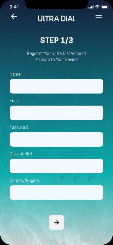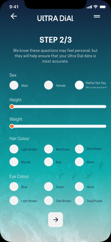 Once the app has downloaded the user will be introduced to the Ultra-Dial Ring and its features. The user will then be prompted to select the “Get Started” button which enables them to sign up and fill in forms such as registration details and to build their personal user profile. This consists of users selecting their skin type, which will ultimately give the app most of the data needed to offer personalized and relevant insights for skin care.